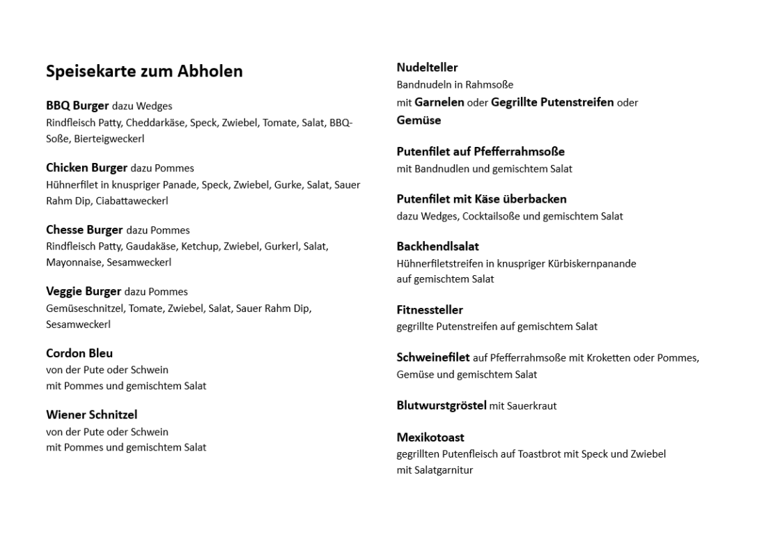 Es besteht die Möglichkeit unsere Speisen für zu Hause bei uns abzuholen!!